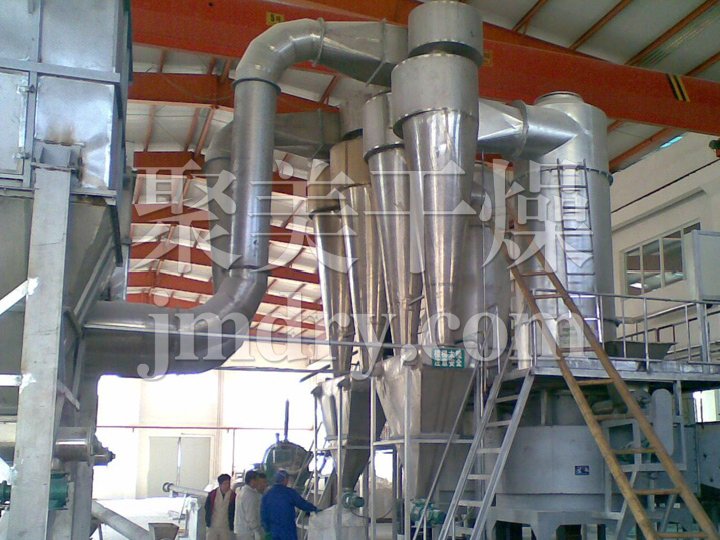 流化床干燥機是由物料自進料進口進入機內,在振動力作用下,物料沿水平面流化床拋擲,向前連續運動,熱風向上穿過流化床同濕物料換熱后,濕空氣經旋風